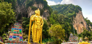 Batu Caves, located just north of Kuala Lumpur, is a magnificent limestone hill complex famous