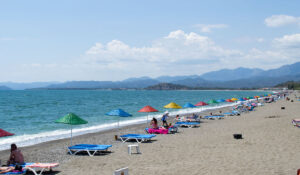 Calis Beach, situated just west of Fethiye on Turkey’s Mediterranean coast, is a popular, sprawling