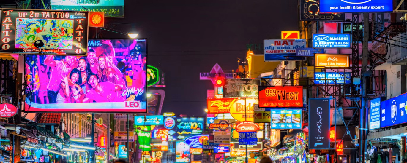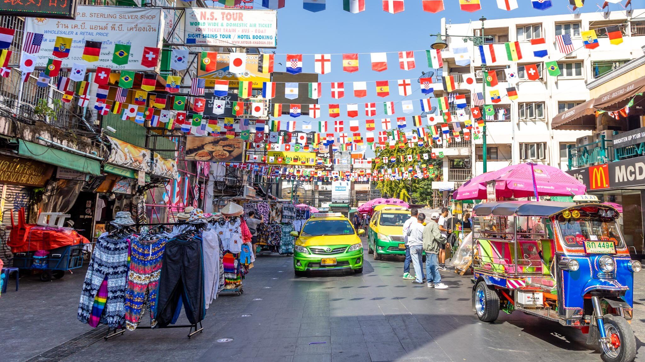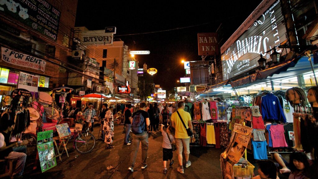 When the sun sets, the road explodes with color and sound. Blaring music from countless bars, neon lights, and a throng of party-goers create an atmosphere of pure, glorious chaos. Street food stalls offer both Thai classics like Pad Thai and adventurous fare, including fried insects. Visitors can grab a cheap beer or the famous Thai “bucket” cocktail and get an open-air Thai massage right on the sidewalk.