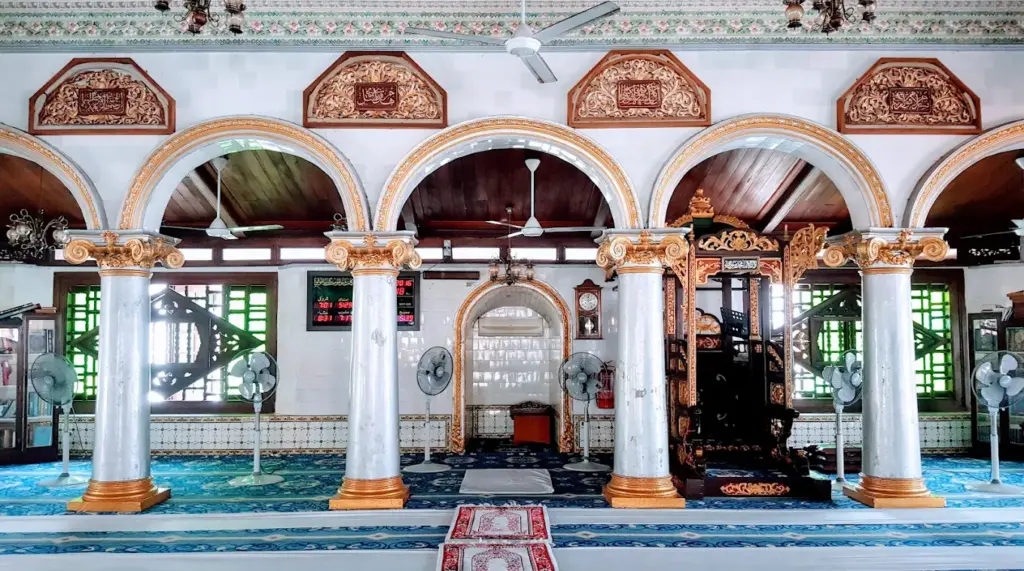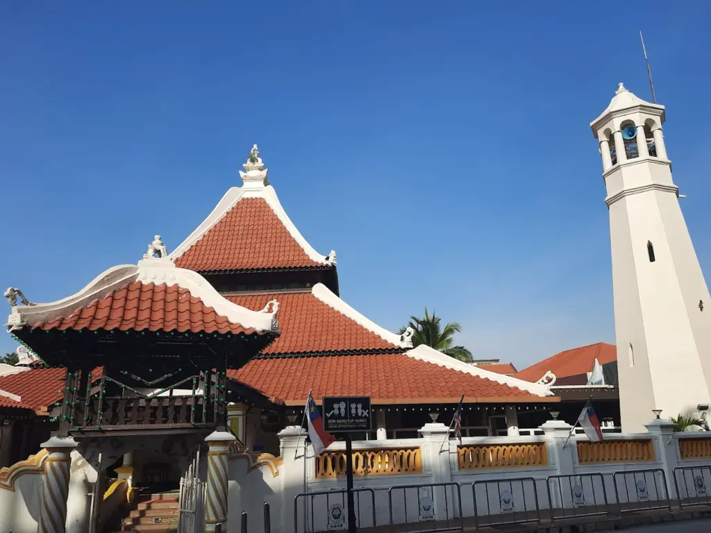 The mosque’s design is a striking synthesis of different cultural influences, reflecting a harmonious blend of Javanese, local Malay, Sumateran, and Chinese architectural styles. Instead of the typical Middle Eastern dome, its prayer hall is crowned with a three-tiered, flared pyramidal roof—a signature feature of traditional Javanese mosques, also known as a meru roof.