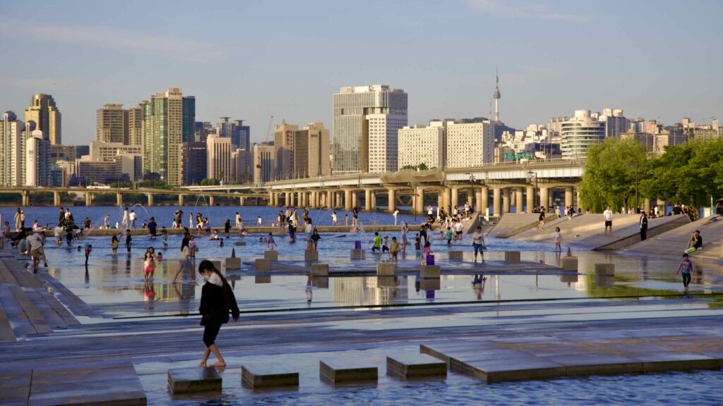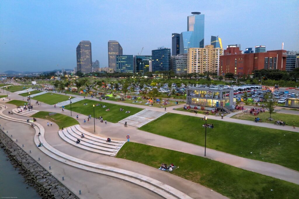 Other attractions include the Yeouido Mulbit Floating Stage for open-air concerts and performances, and the departure point for scenic Eland River Cruises. Throughout the warmer months, it also hosts the popular Bamdokkaebi Night Market, offering global food and goods against the city skyline. It serves as an essential urban oasis for relaxation and cultural enjoyment.