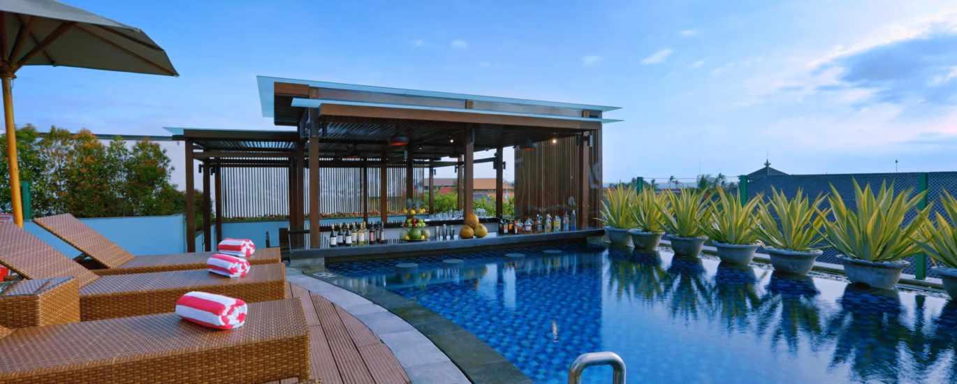 This isn’t just a place to sleep; it’s a place to recharge for the next adventure. Head to the rooftop swimming pool to soak up the sun, enjoy a casual dip, or watch the famous Balinese sunset paint the sky—all while sipping a cool drink from the sunken bar.